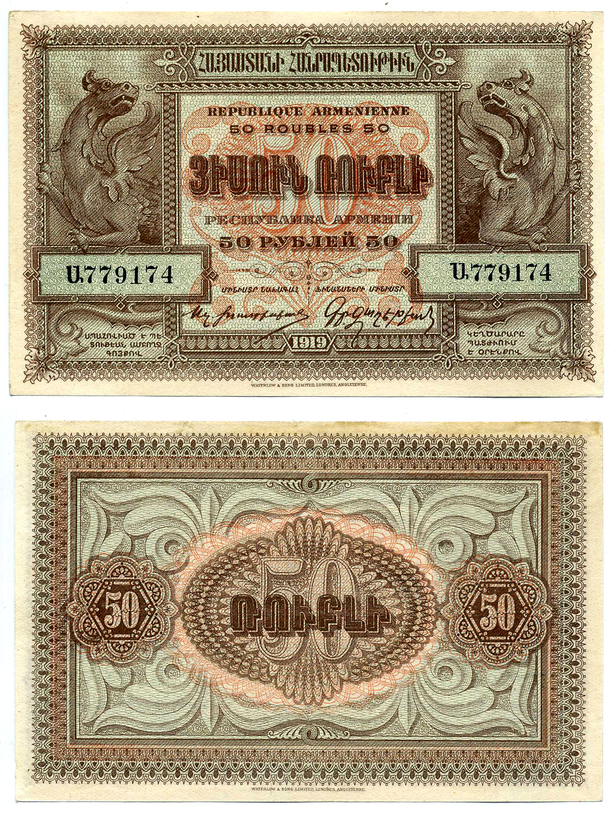 ------Демократическая Республика Армения 50 рублей 1919 (1920) выпуск Дашнакского правительства, литера "А", на белой бумаге Pick 30, Кардаков К 8.4.34 бумага 2198-17-1-1