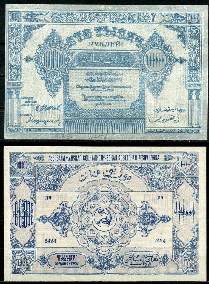 ------Азербайджанская ССР 100000 рублей 1922 бона, без водяного знака, светло-голубая Pick S717 b, Кардаков К8.7.9а бумага 444-38-2-2