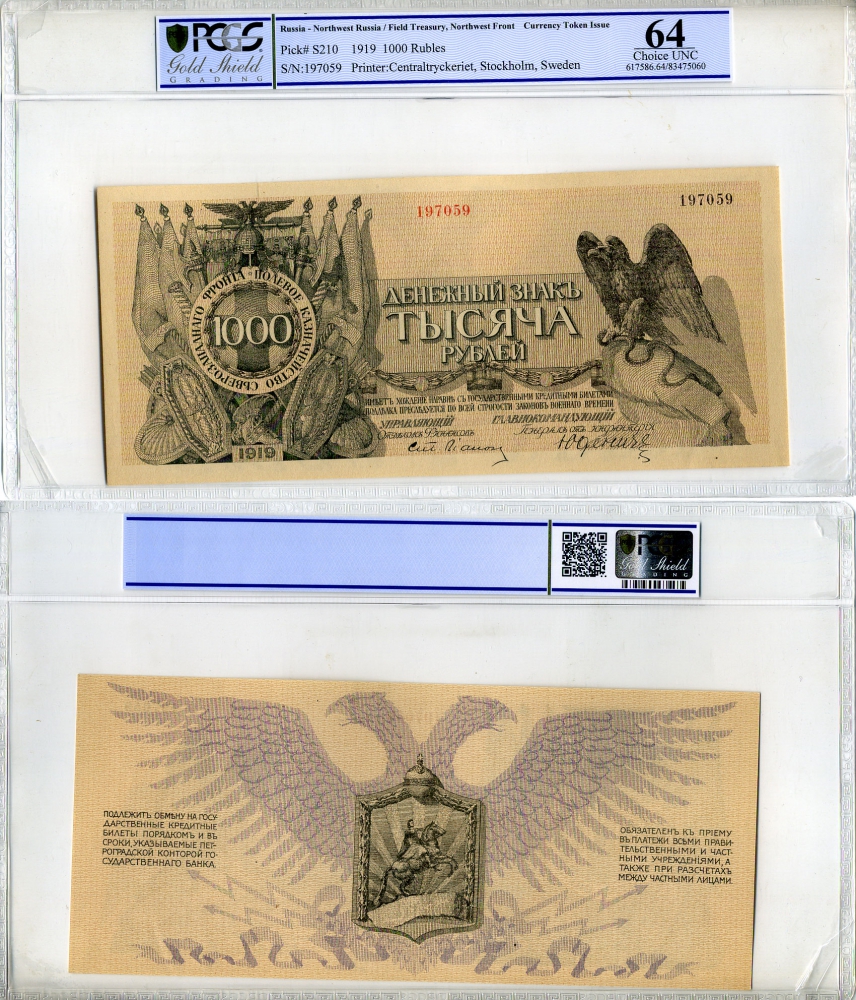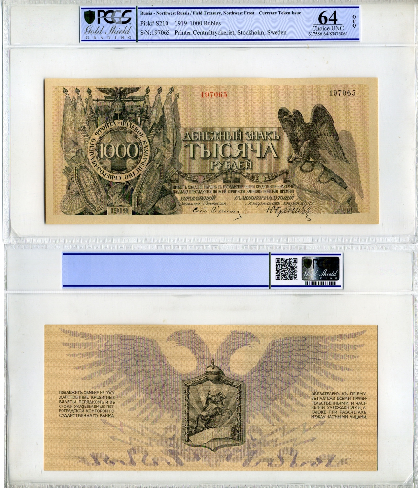 Полевое казначейство Северо-Западного фронта 1000 рублей 1919 денежный знак, Юденич, в слабе PCGS 64 Choice UNC Pick S210 бумага UNC (пресс) 452-1-02