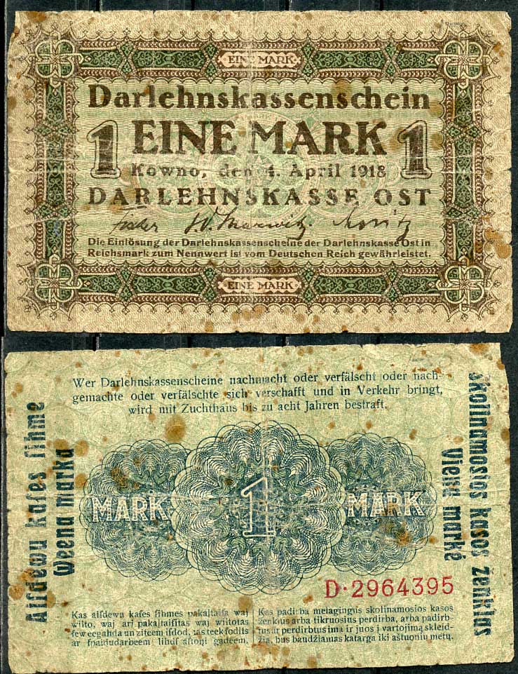 Литва, немецкая оккупация 1 марка 1918 Darlehnskasse Ost, Ковно (Каунас) Pick R128 бумага 439-1-2-1