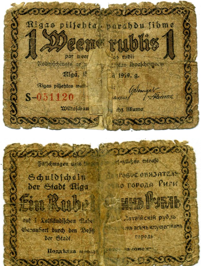РИГА 1 рубль 1919 ДОЛГОВОЕ ОБЯЗАТЕЛЬСТВО ГОРОДА РИГИ 15 августа 1919, серия S Pick 202.1, Кардаков К17.7.6 бумага G 437-11-3-1