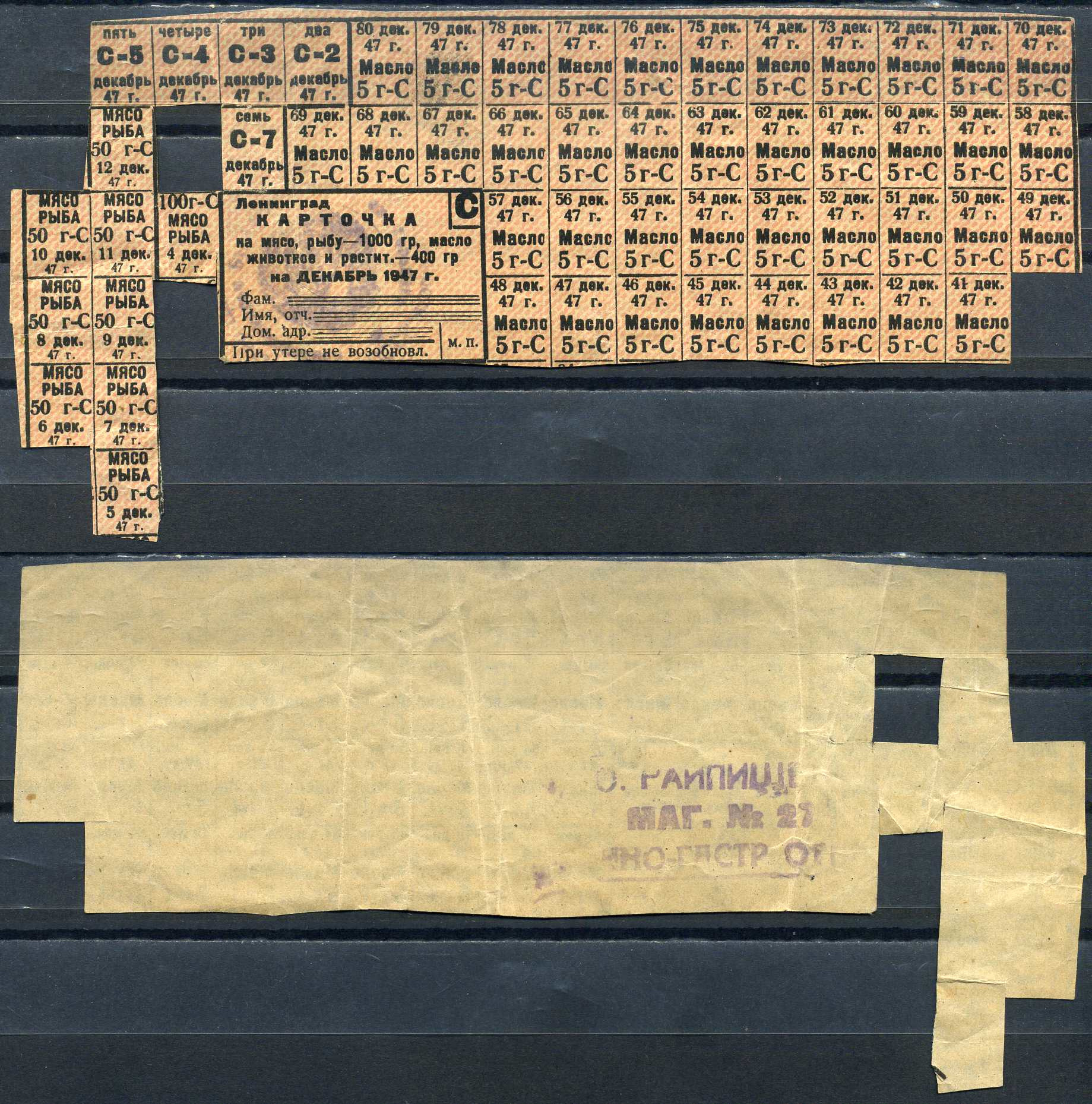 Ленинград карточка на мясо, рыбу - 1000 гр., масло животное и растительное - 400 гр на декабрь 1947 7552-7-1-2