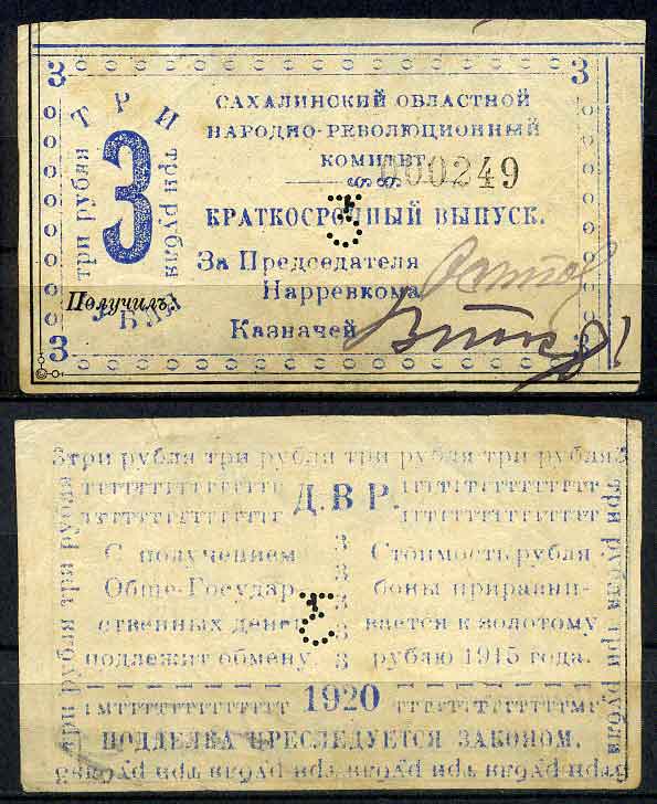 Сахалинский областной народно-революционный комитет (село Кербь) 3 рубля 1920 Бона. Кардаков, с. 230, раздел 15, № 14, (25 дойчмарок), Pick S 1277 бумага 10-2-24-1