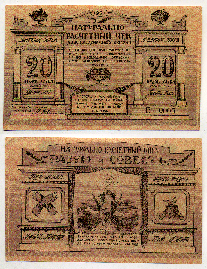 Киев, Натуральный расчетный союз "Разум и Совесть" 20 пудов хлеба 1921 Натуральный расчетный знак, 1 буква в серии, 5 цифр Рябченко 4844 бумага 000-00-00