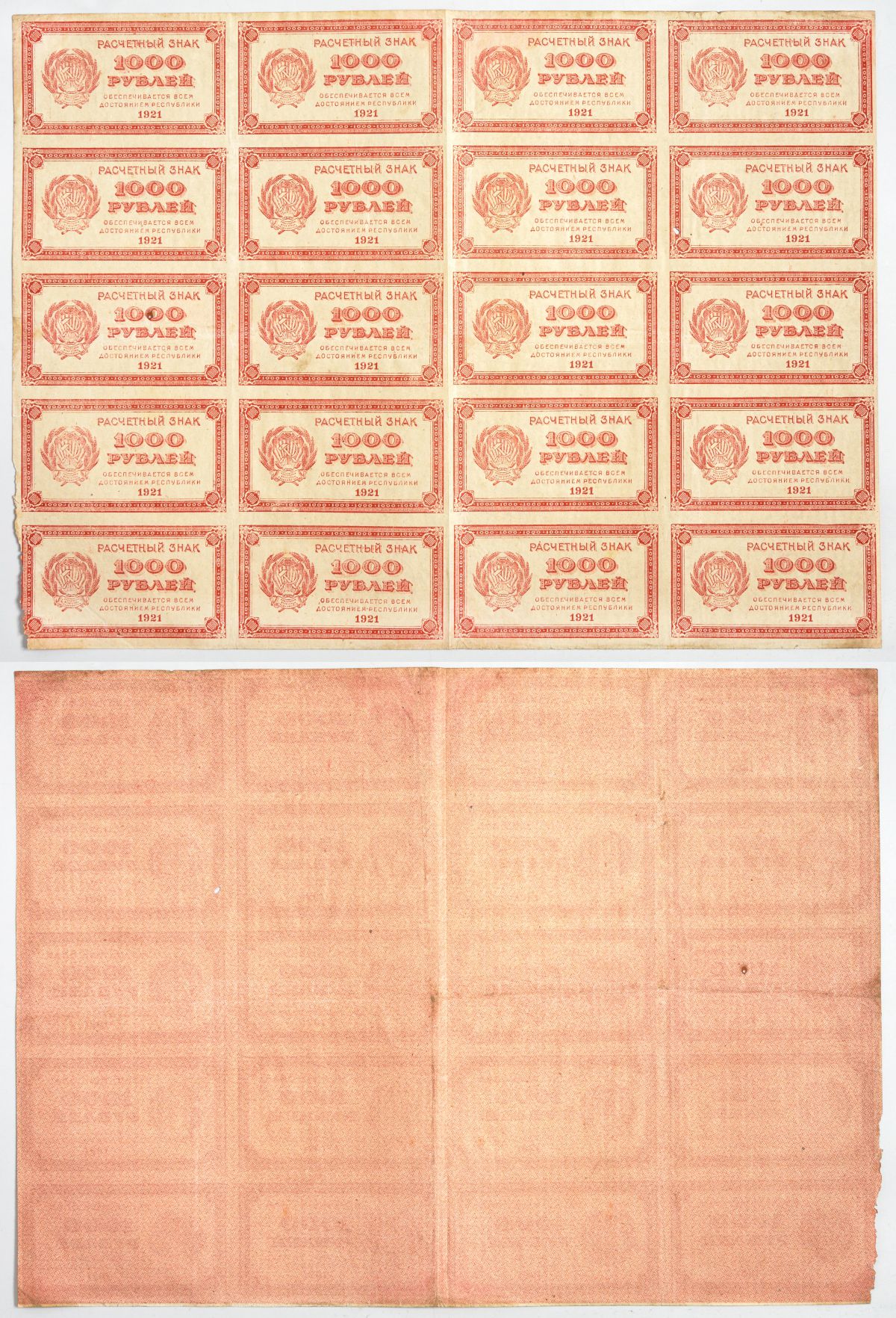 Россия 1000 рублей 1921 Лист из 20 штук, водяной знак цифры номинала Горянов 2.6.16 бумага 49-32-1