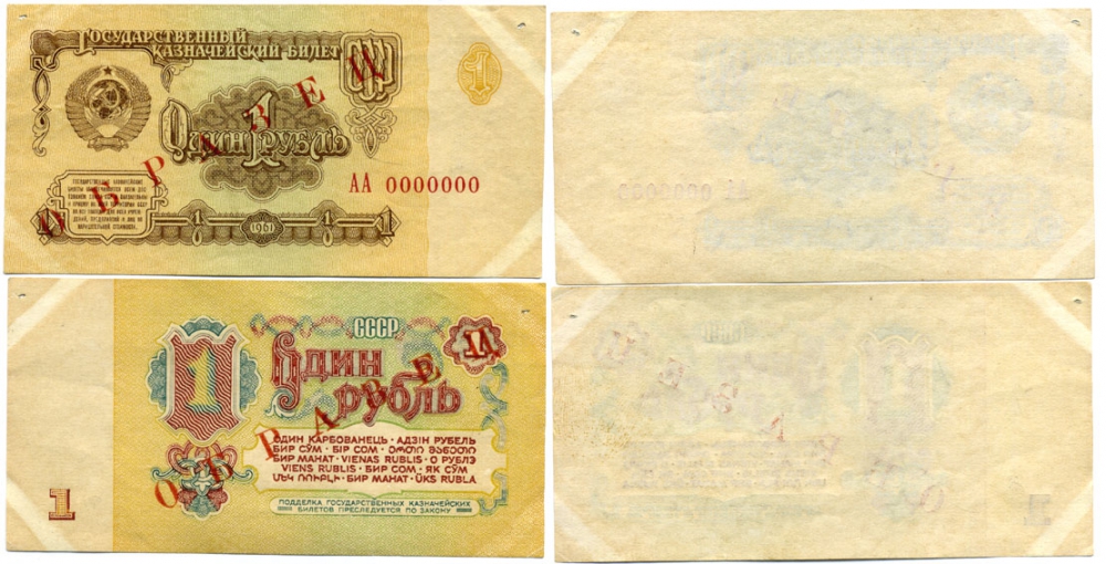 СССР 1 рубль 1961 Государственный казначейский билет СССР, образец, каждая сторона отдельно, серия АА. № 0000000 ZG № 2.31.10 бумага 451-328-1