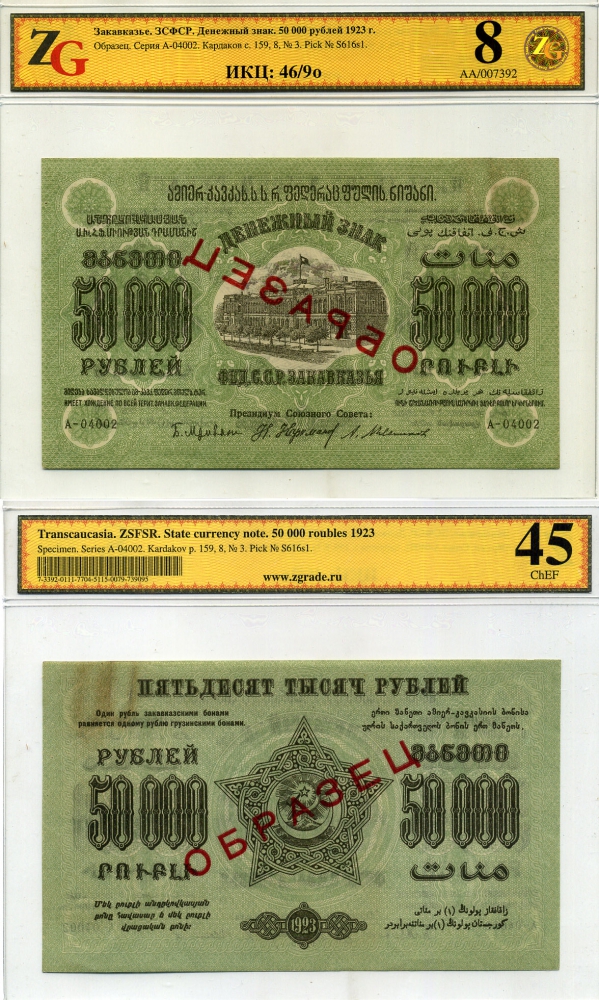 ---Федеративный Союз Социалистических Советских Республик Закавказья 50000 рублей 1923 ОБРАЗЕЦ, в холдере компании ZG. Сохранность - 8 Pick S616s1, Кардаков с. 159, 8 № 3 бумага aUNC 452-1-66НовинкиАнтичность и раннее СредневековьеМонеты - ГерманияМонеты - ЕвропаМонеты - Австралия и ОкеанияМонеты - АзияМонеты - АмерикаМонеты - АфрикаМонеты - Россия, СССР, страны СНГ и БалтииБанкнотыАксессуары, ЛитератураОткрытки, карточкиАкции, облигацииЖетоны, Медали, ЗнакиМаркиКартины, декоративно-прикладное искусство