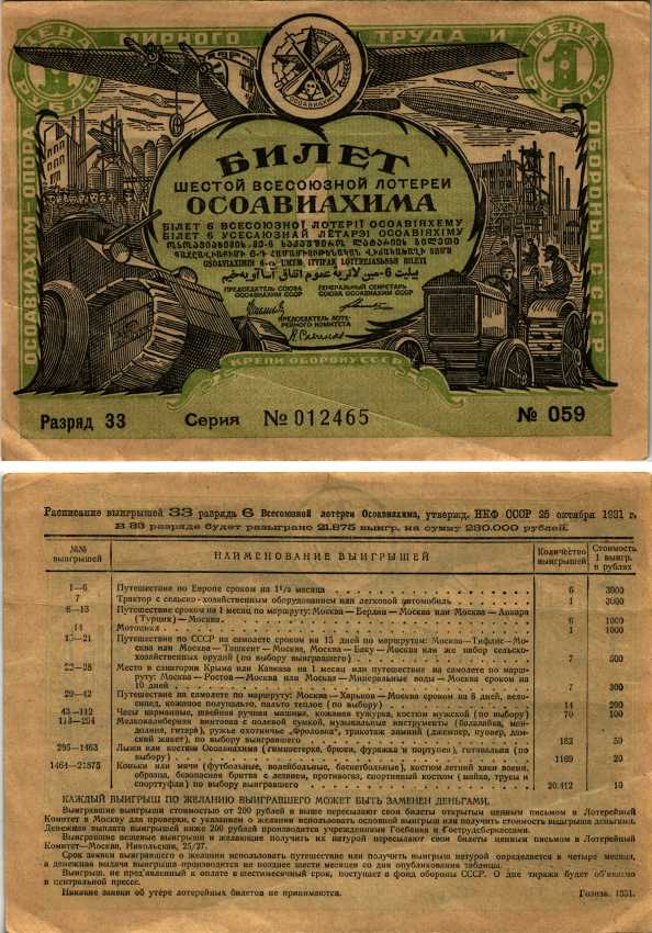 СССР 1 РУБЛЬ 1936 ОДИННАДЦАТАЯ ВСЕСОЮЗНАЯ ЛОТЕРЕЯ ОСОАВИАХИМА бумага 444-152-2