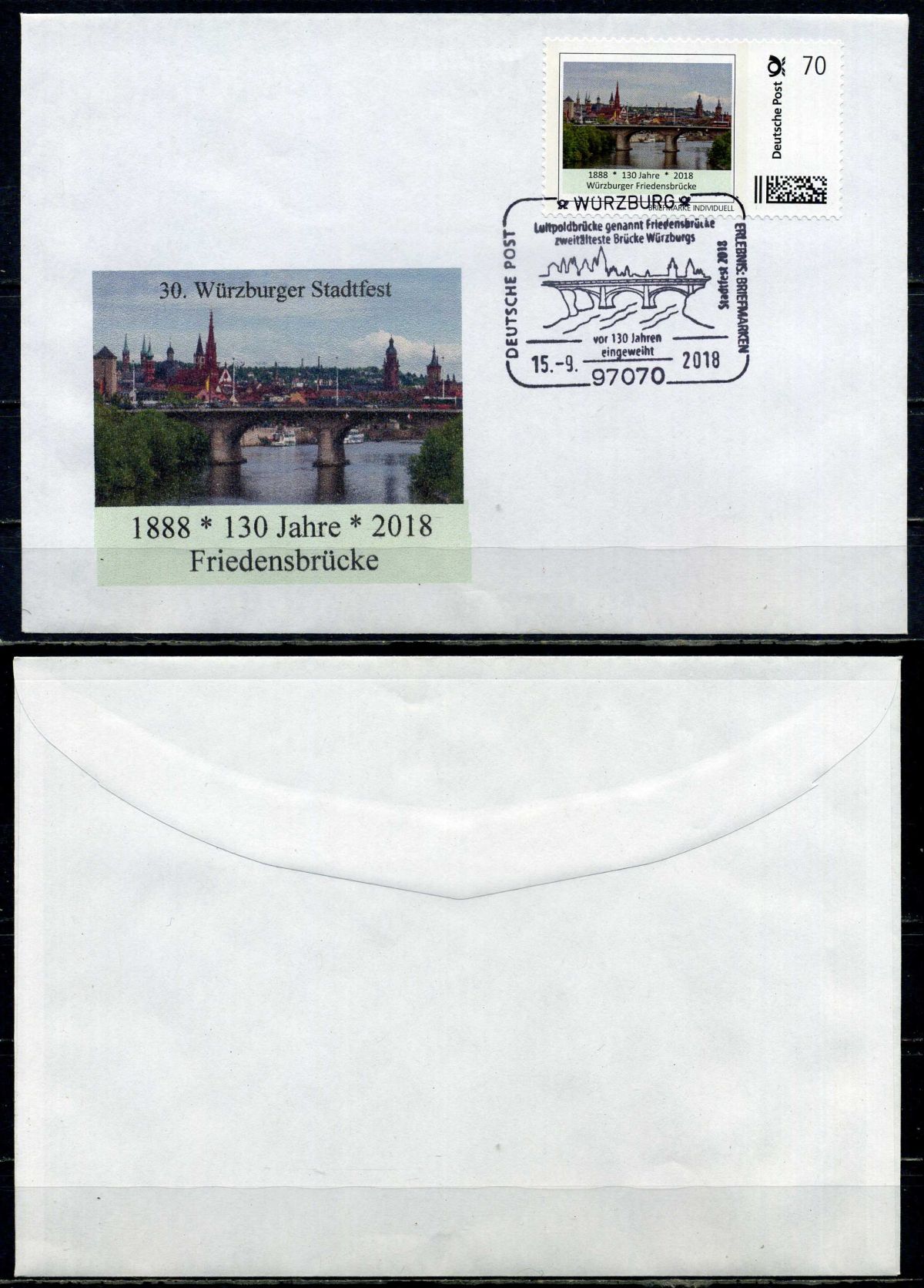 Германия конверт с маркой первого дня гашения 2018 130 лет строительства, Мост Мира (Вюрцбург) бумага 6294-81-1-2