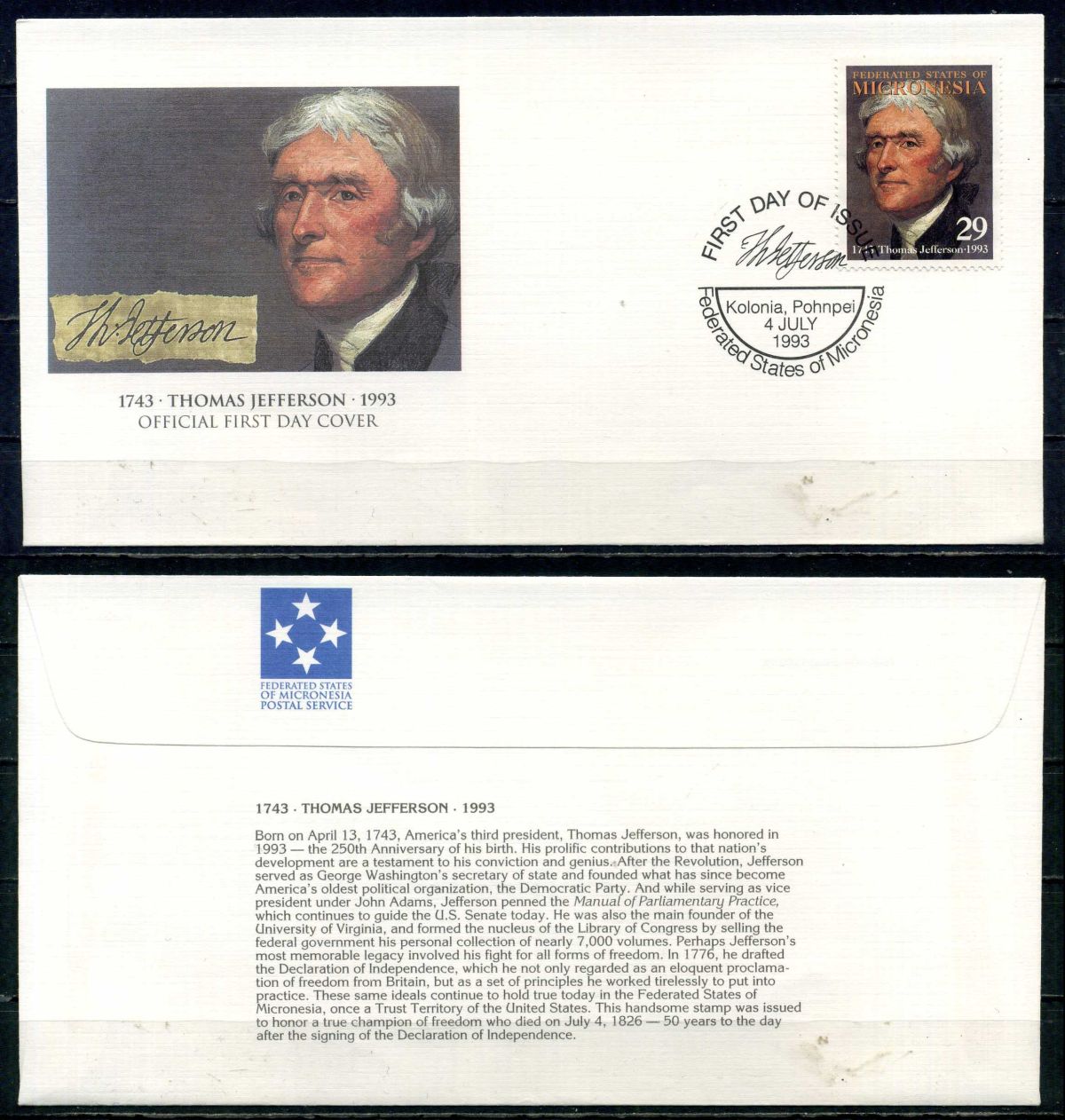 Микронезия конверт с маркой первого дня гашения 1993 Томас Джефферсон, США бумага 6294-77-1-1