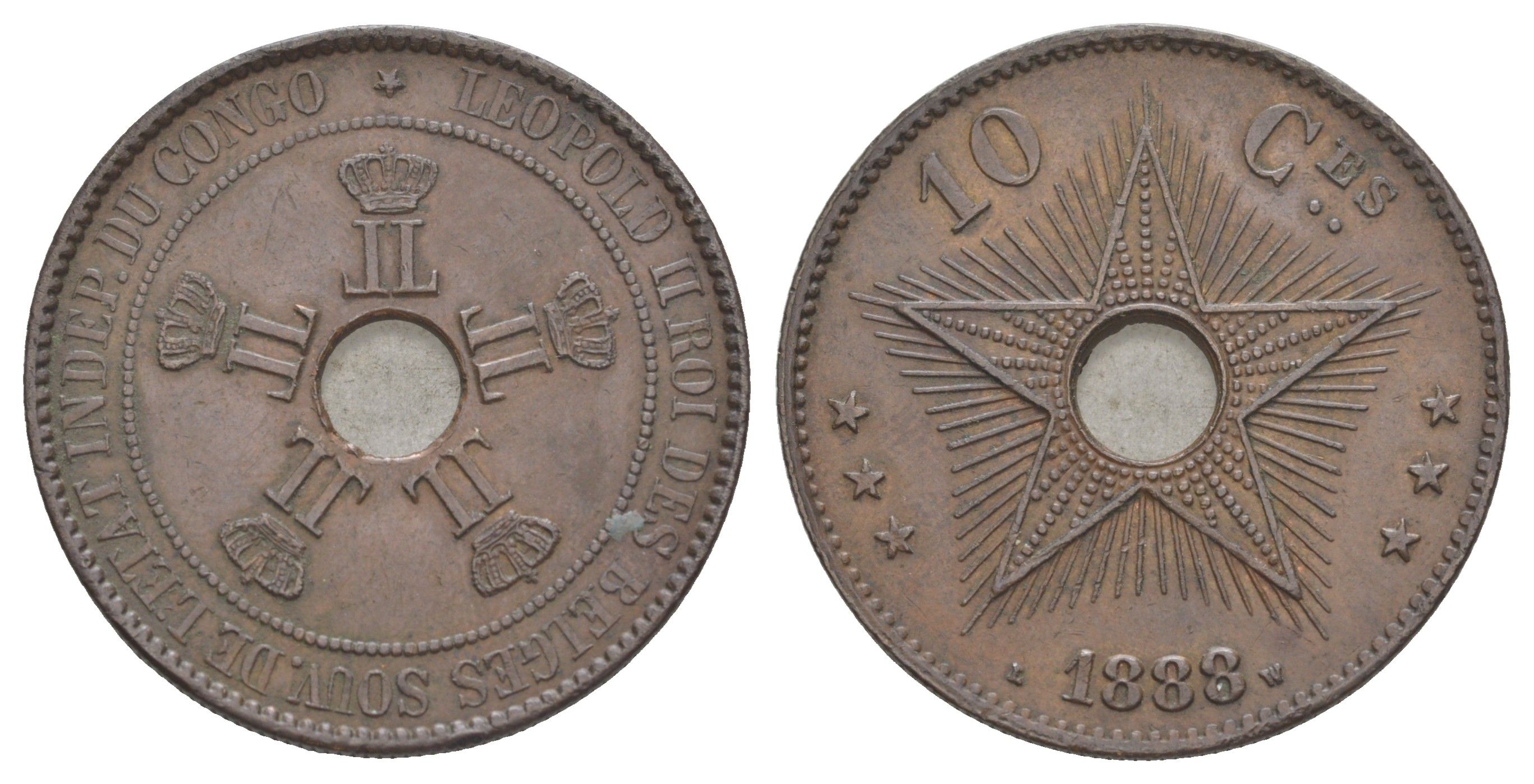 Бельгийское Конго 10 сантимов 1888 Свободное государство Конго, Леопольд II (1865-1909) KM 4 медь 4127-435