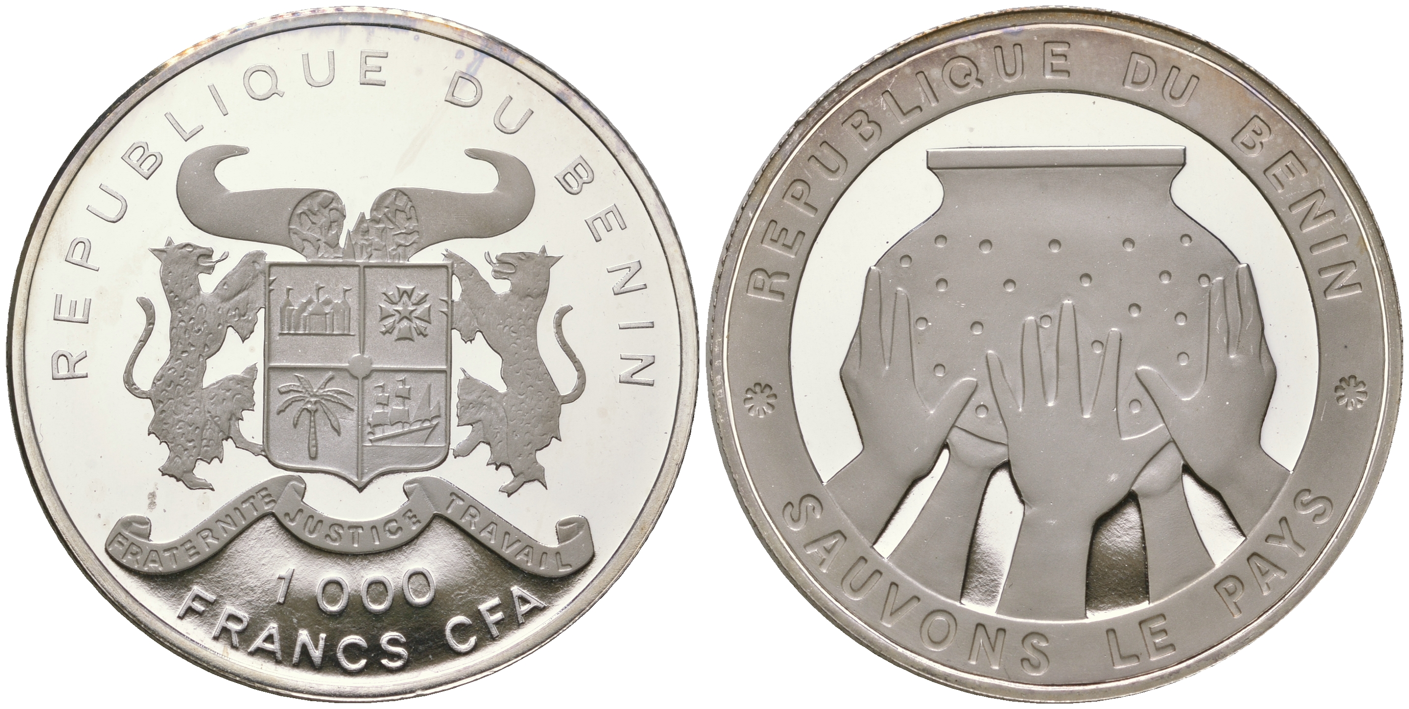 Бенин 1000 франков 1992 спасите страну, пять рук держат сосуд KM 1 серебро PROOF 11-143-22