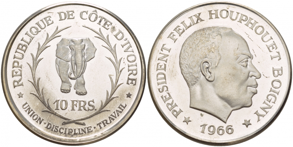 Берег слоновой кости 10 франков 1966 Президент Феликс Уфуэ-Буаньи, слон КМ 1 серебро PROOF 1081-4-63