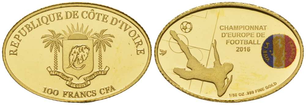 Берег слоновой кости 100 франков 2016 чемпионат Европы по футболу во Франции, овал, эмаль KM NEW золото PROOF 00-815-26
