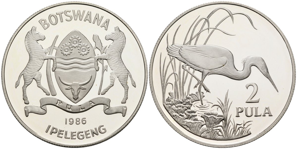 Ботсвана 2 пула 1986 серия защита окружающей среды, тихоокеанская белая цапля, тираж 25000 экз. KM 18 серебро PROOF 1078-2-63