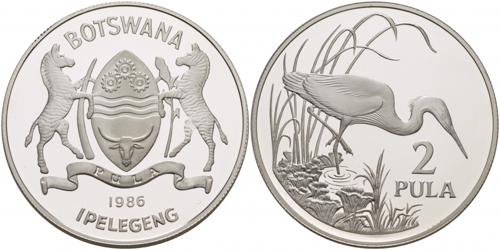 Ботсвана 2 пула 1986 серия защита окружающей среды, тихоокеанская белая цапля, тираж 25000 экз. KM 18 серебро PROOF 01-147-21