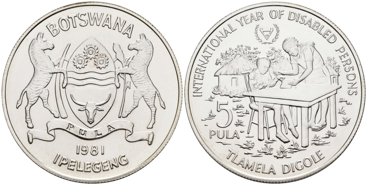Ботсвана 5 пула 1981 международный год инвалидов, тираж 13000 экз. KM 15 серебро UNC 1080-5-44