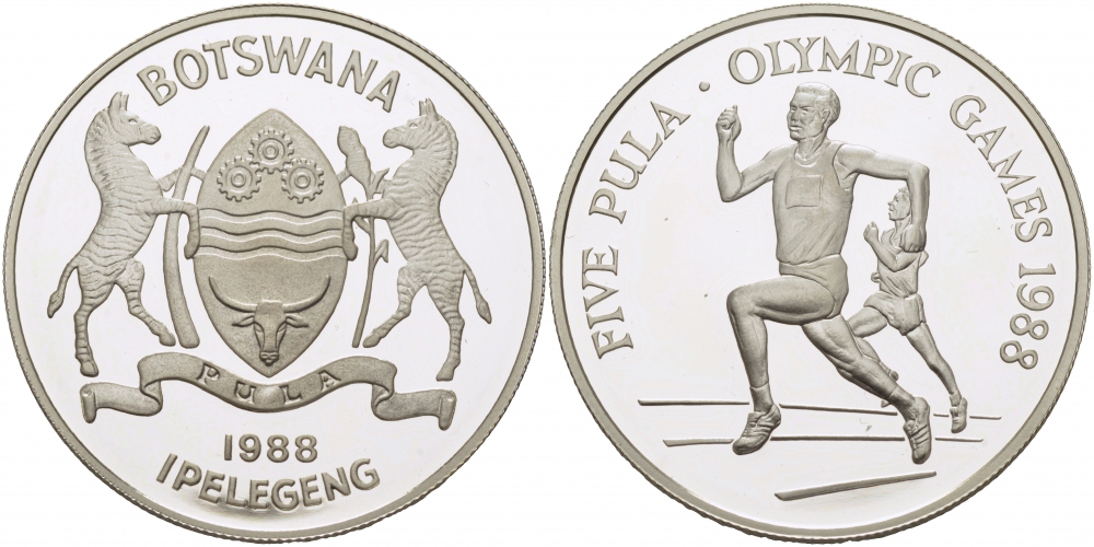 Ботсвана 5 пула 1988 XIV летние олимпийские игры в Сеуле, бег, тираж 25000 экз. КМ 21 серебро PROOF 1077-8-64