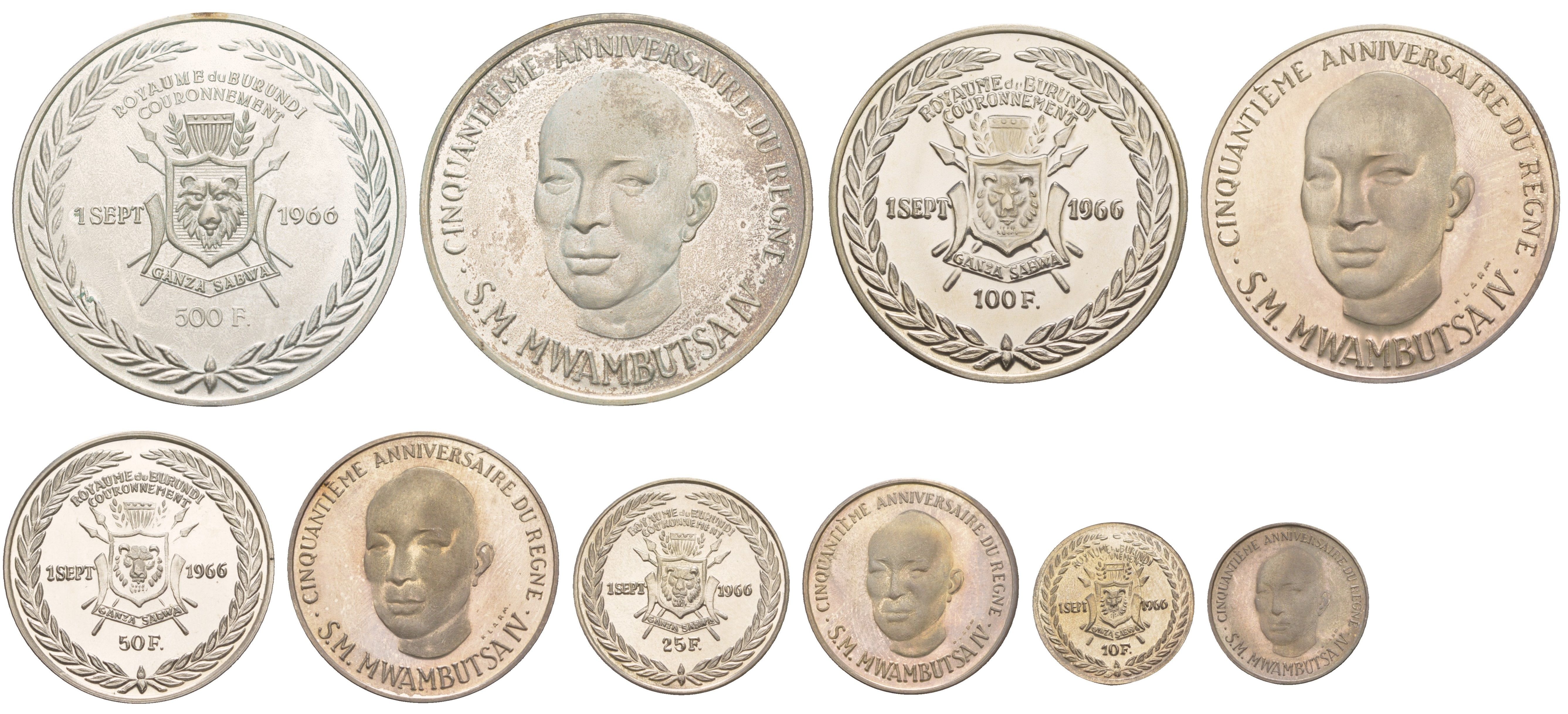 Бурунди полный набор из 5 монет (10, 25, 50, 100 и 500 франков 1966 50 лет правления Мвамбутса IV X 1, 2, 3, 4 и 5 серебро PROOF 00-819-73