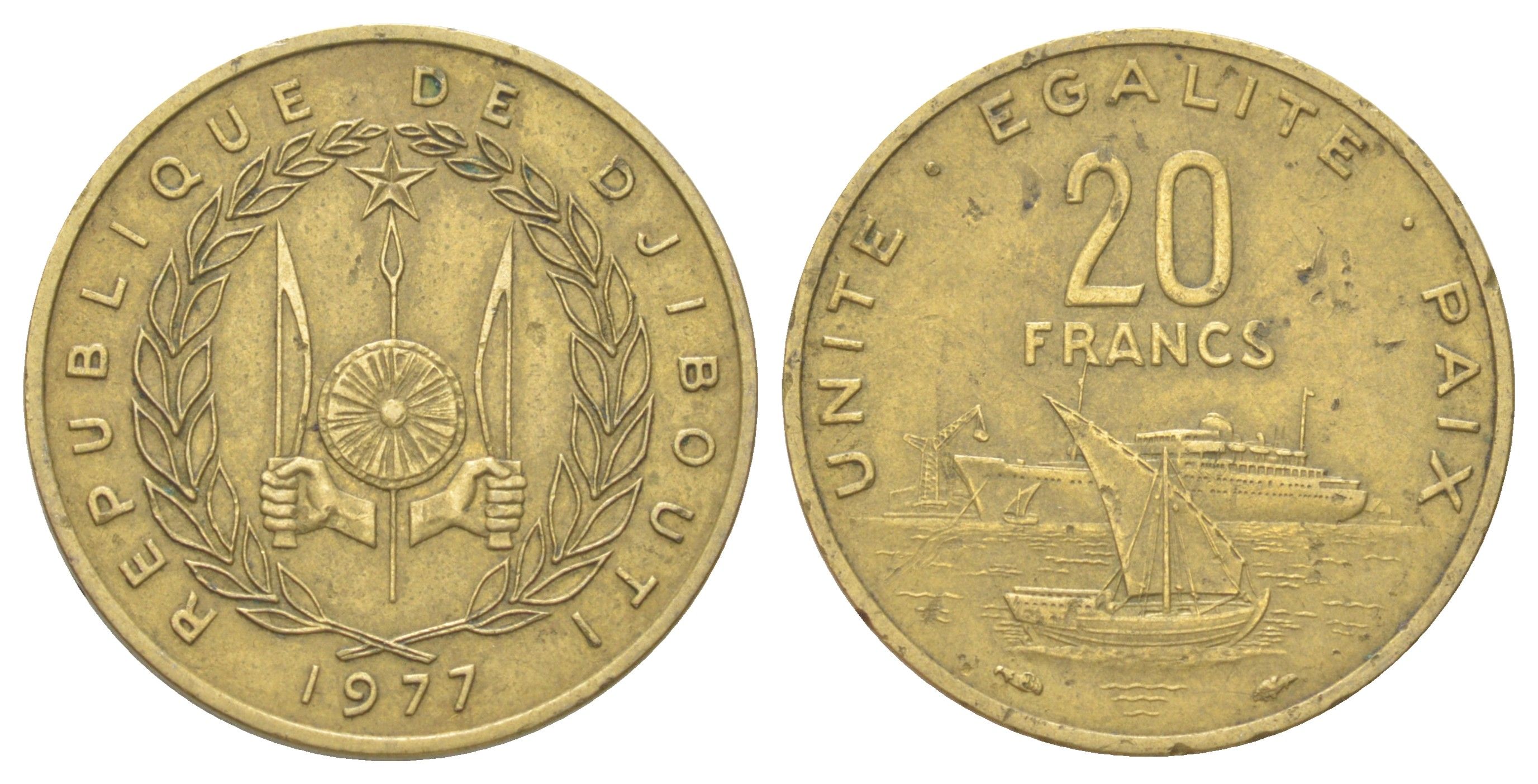 -Джибути 20 франков 1977 KM 24 медь алюминий никель 4622-1257ТунисЮАРАлжирСвазилендСейшельские островаСомалиСуданСьерра-ЛеонеТанзанияТогоУгандаФранцузская Западная АфрикаЦентрально-Африканские ШтатыЭкваториальная ГвинеяЭритреяЭфиопияСан-Томе и ПрисипиГвинея-БисауБенинБельгийское КонгоБерег слоновой костиМалиНигерОстров ВознесенияЧадЗападная СахараЦентральноафриканская Республика (ЦАР)ГабонМавританияСомалилендБуркина ФасоРодезияАнголаБотсванаБританская Западная АфрикаБурундиВосточная АфрикаГамбияГанаГвинеяЕгипетЗаир (Катанга)ЗамбияЗападно-Африканские ШтатыЗимбабвеКабо-ВердеКамерунКенияКоморские островаКонгоЛесотоЛиберияЛивияМаврикийМадагаскарМалавиМароккоМозамбикНамибияНигерияОстров Святой ЕленыРуандаДругие страны