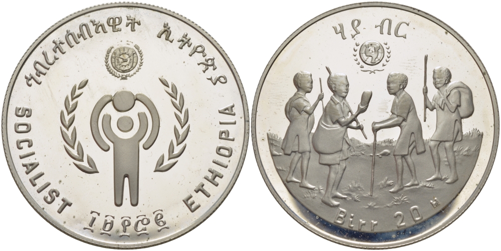 Эфиопия 20 быров 1980 ЕЕ1972, ООН, международный год защиты детей KM 54 серебро PROOF 02-208-12