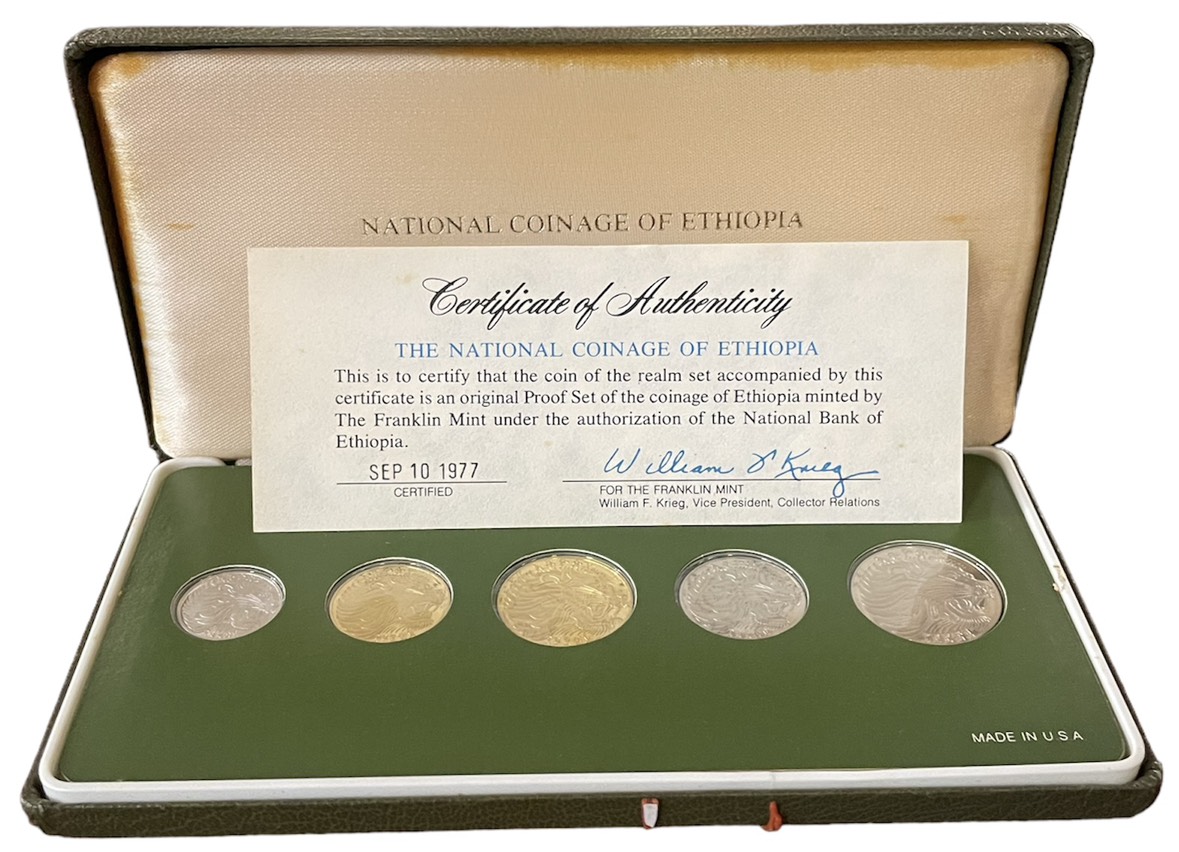 Эфиопия набор из 5 монет 1977 FM, в оригинальной коробке с сертификатом KM PS 7, KM (43.2-47.2) PROOF 00-00