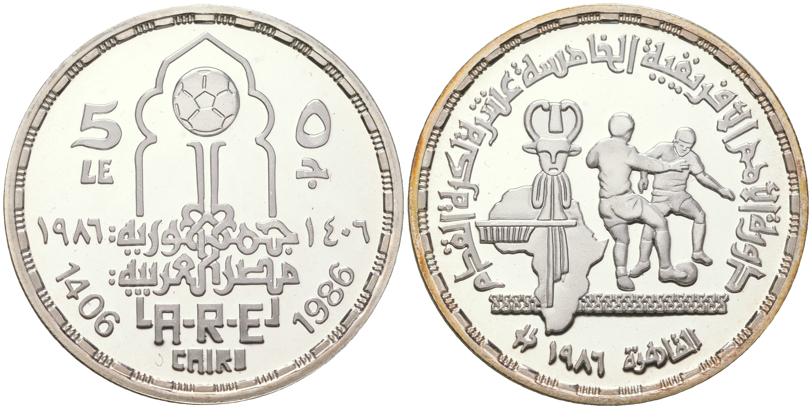 Египет 5 фунтов 1986 АН1406, кубок Африки по футболу, игроки KM 590 серебро PROOF 11-275-43