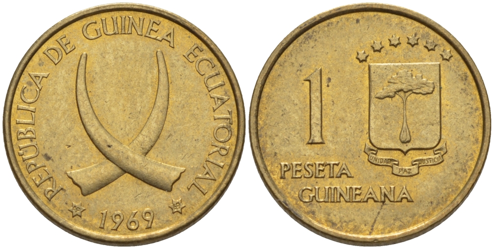 ЭКВАТОРИАЛЬНАЯ ГВИНЕЯ 1 ПЕСЕТА 1969 РЕСПУБЛИКА, ДИАМЕТР 19,5 ММ. KM 1 алюминиевая бронза 66-758