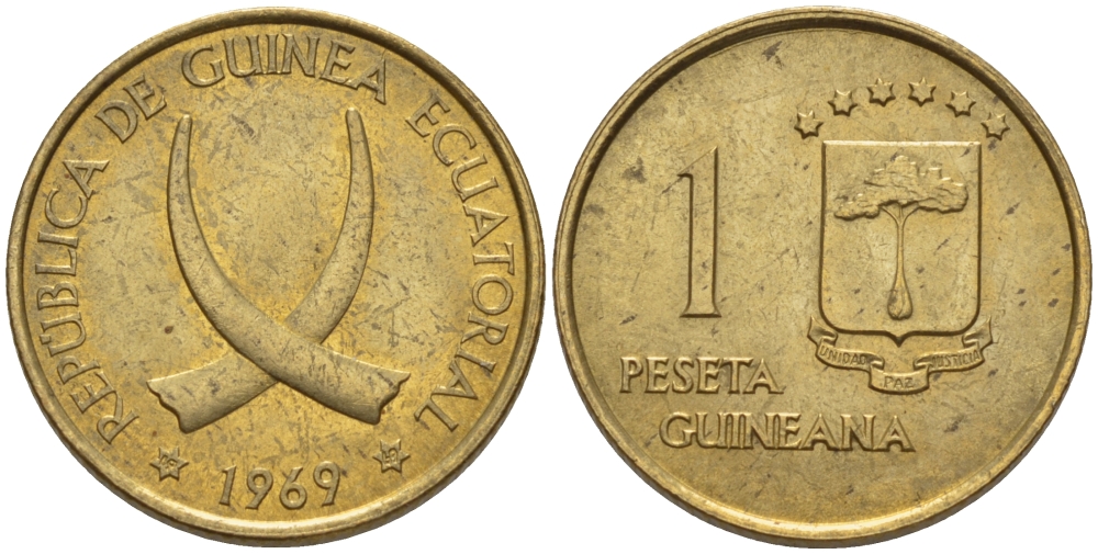 ЭКВАТОРИАЛЬНАЯ ГВИНЕЯ 1 ПЕСЕТА 1969 РЕСПУБЛИКА, ДИАМЕТР 19,5 ММ. KM 1 алюминиевая бронза 66-761