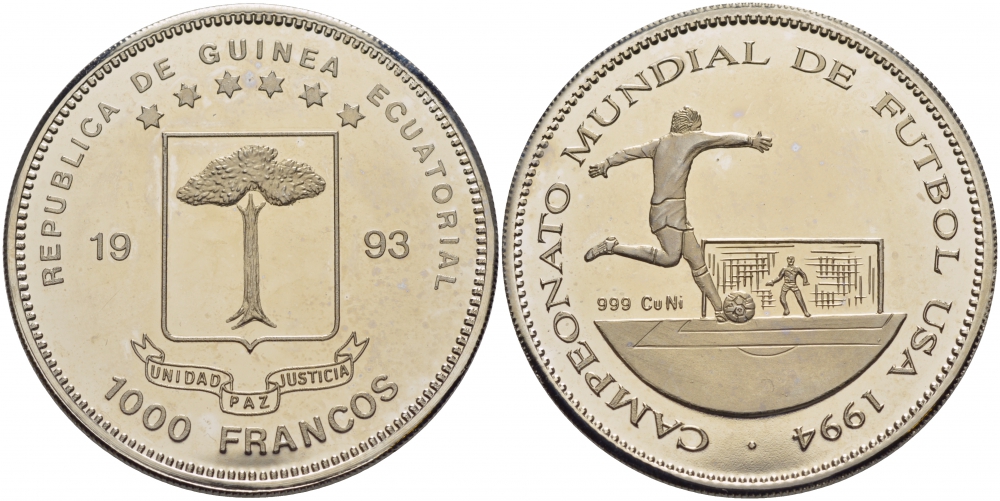 Экваториальная Гвинея 1000 франков 1993 чемпионат мира по футболу KM PN 33 медно-никель PROOF 1078-8-33
