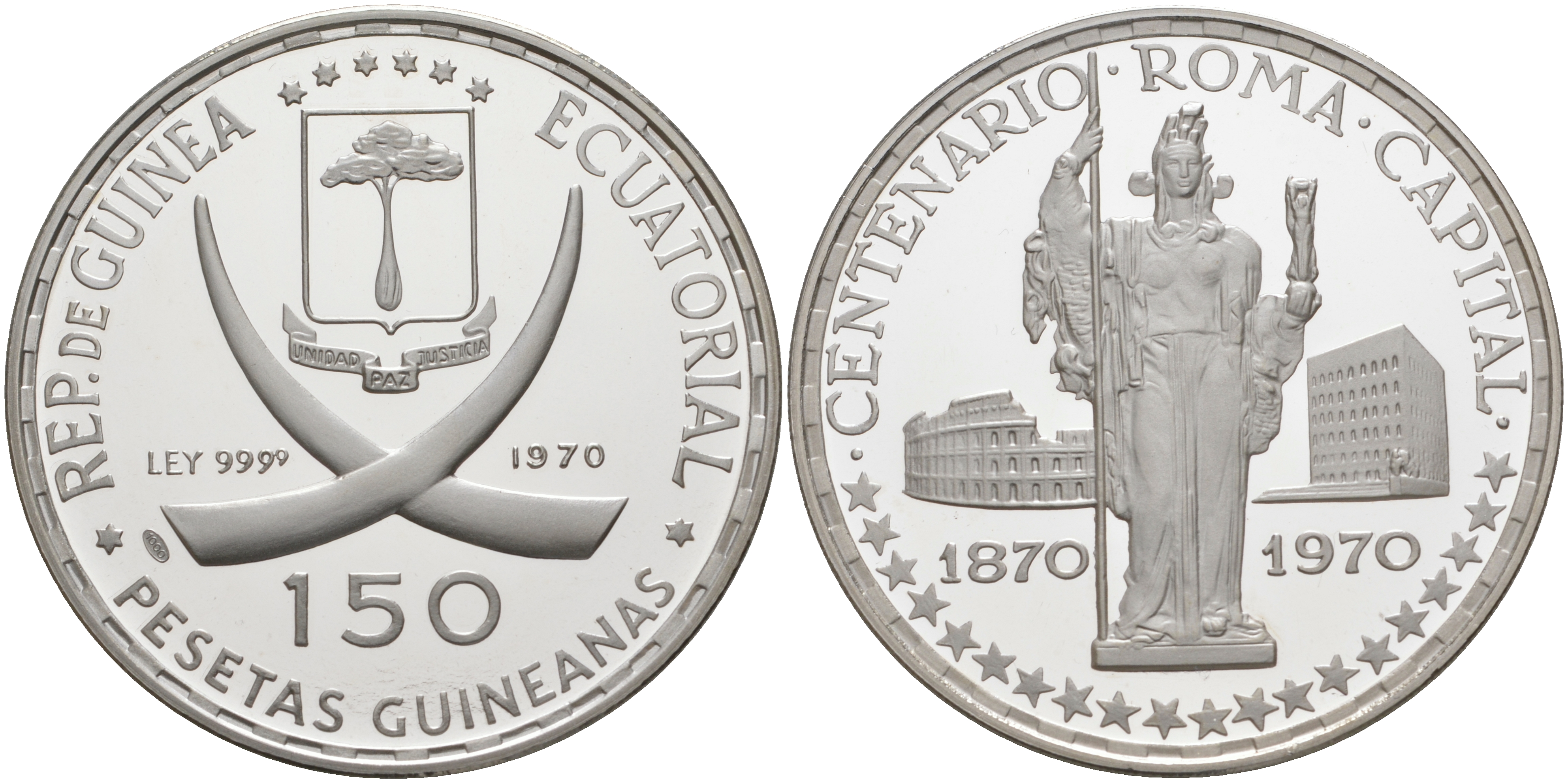 Экваториальная Гвинея 150 песет 1970 100 лет Риму как столице Италии, стоящая Афина KM 16 серебро PROOF 01-161-15