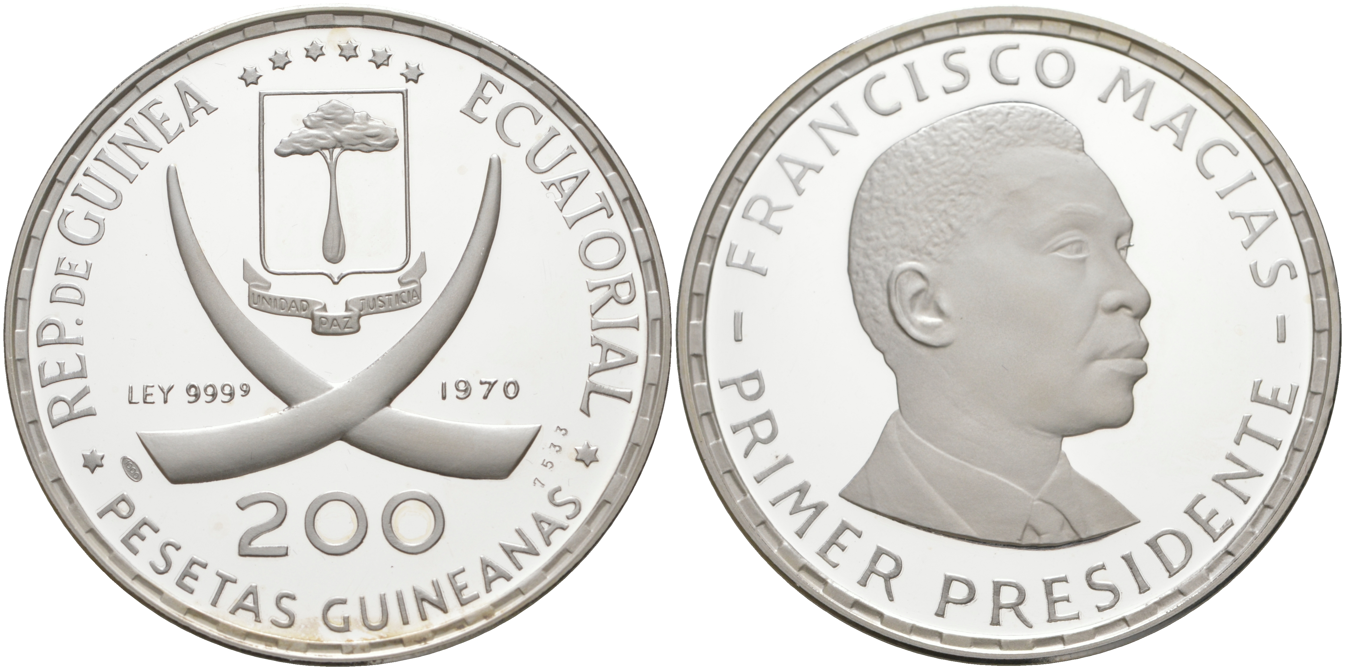 Экваториальная Гвинея 200 песет 1970 Первый президент Франсиско Масиас Нгема (1924-1979) KM 19 серебро PROOF 01-021-12-2