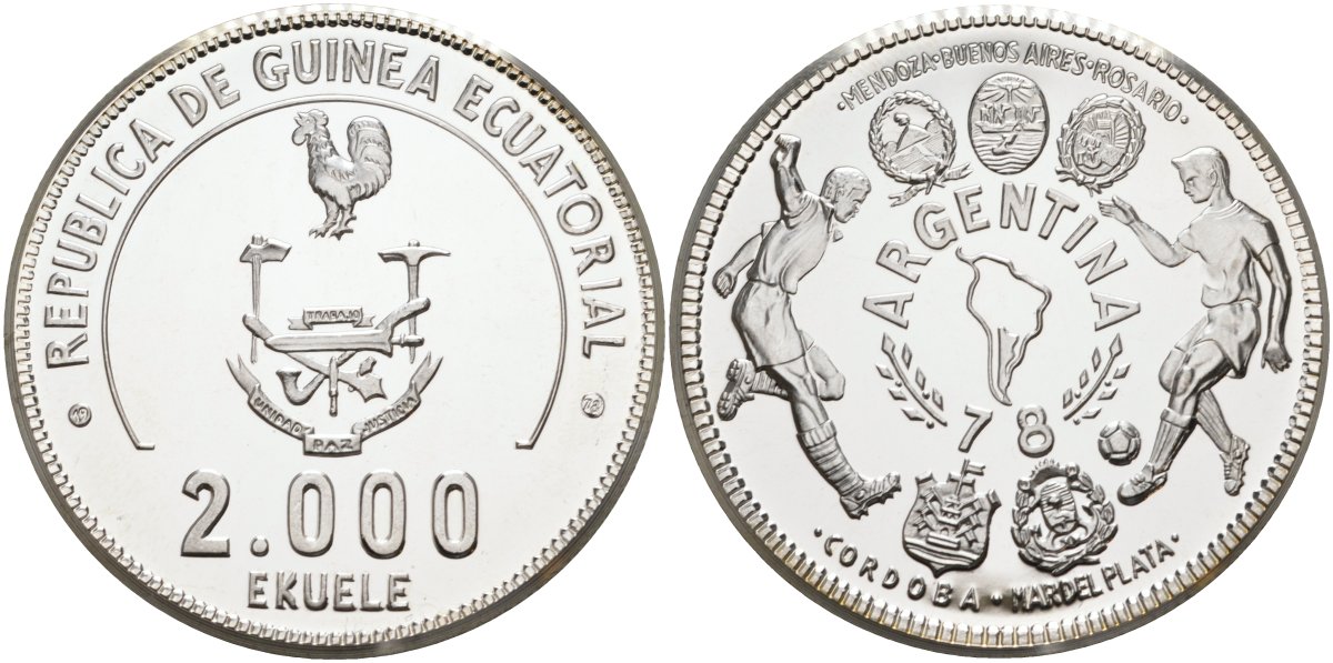 Экваториальная Гвинея 2000 экуэле 1979 чемпионат мира по футболу в Аргентине 1978 года, вес 42,87 гр., тираж 195 экз. KM 38 серебро PROOF 04-320-43