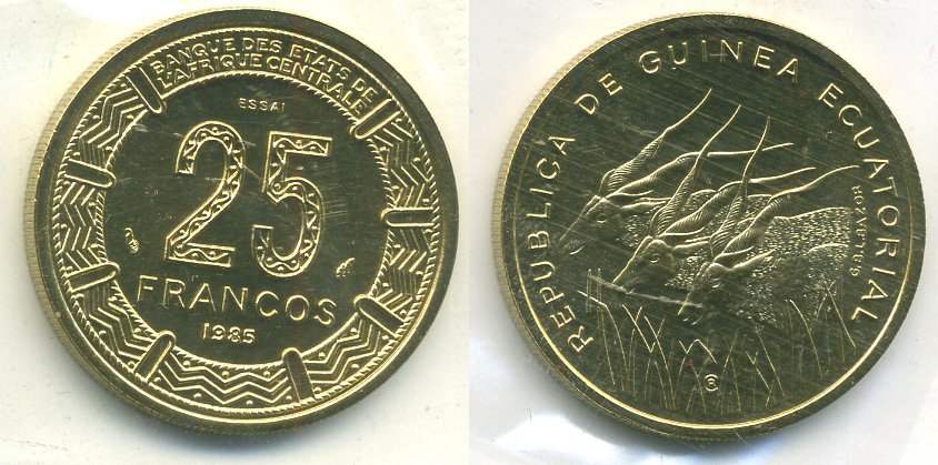 ЭКВАТОРИАЛЬНАЯ ГВИНЕЯ 25 ФРАНКОВ 1985 PROBA, ESSAI KM E29 алюминиевая бронза UNC 5010-1134