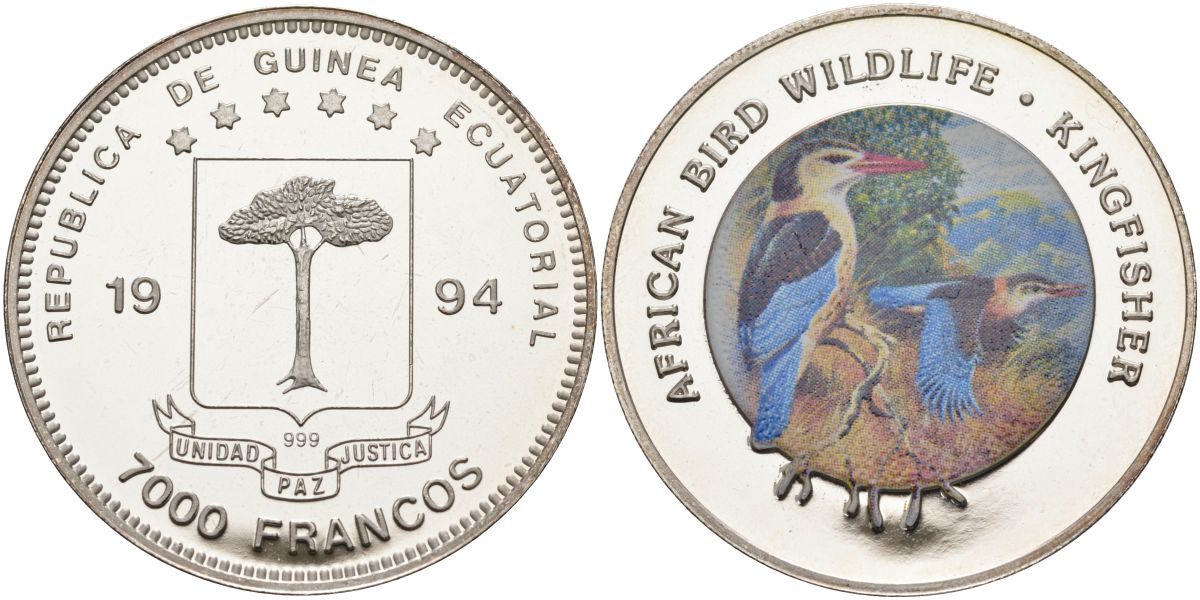Экваториальная Гвинея 7000 франков 1994 серия защитим наш мир, обыкновенный зимородок, цветная эмаль KM 98 серебро PROOF 04-138-23