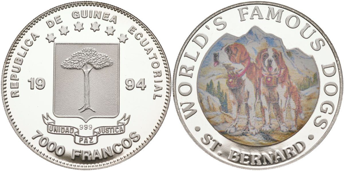 ----Экваториальная Гвинея 7000 франков 1994 серия знаменитые породы собак, сенбернар, тираж 7500 экз. KM 99 серебро PROOF 11-322-15