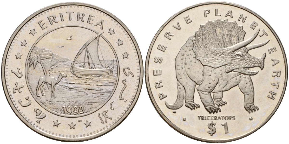 Эритрея 1 доллар 1993 берегите планету Земля, Трицератопс KM 10 медно-никель UNC 4125-832