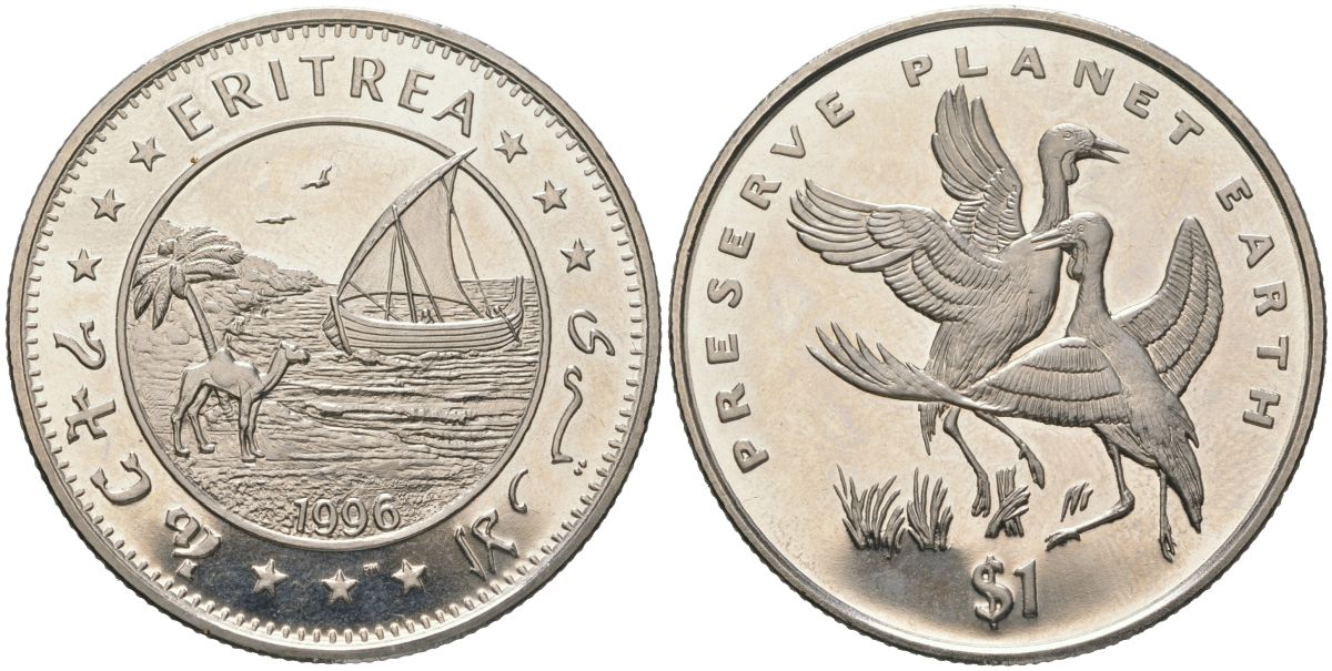 ----Эритрея 1 доллар 1996 берегите планету Земля - Серёжчатые журавли KM 34 медно-никель BU 4368-713