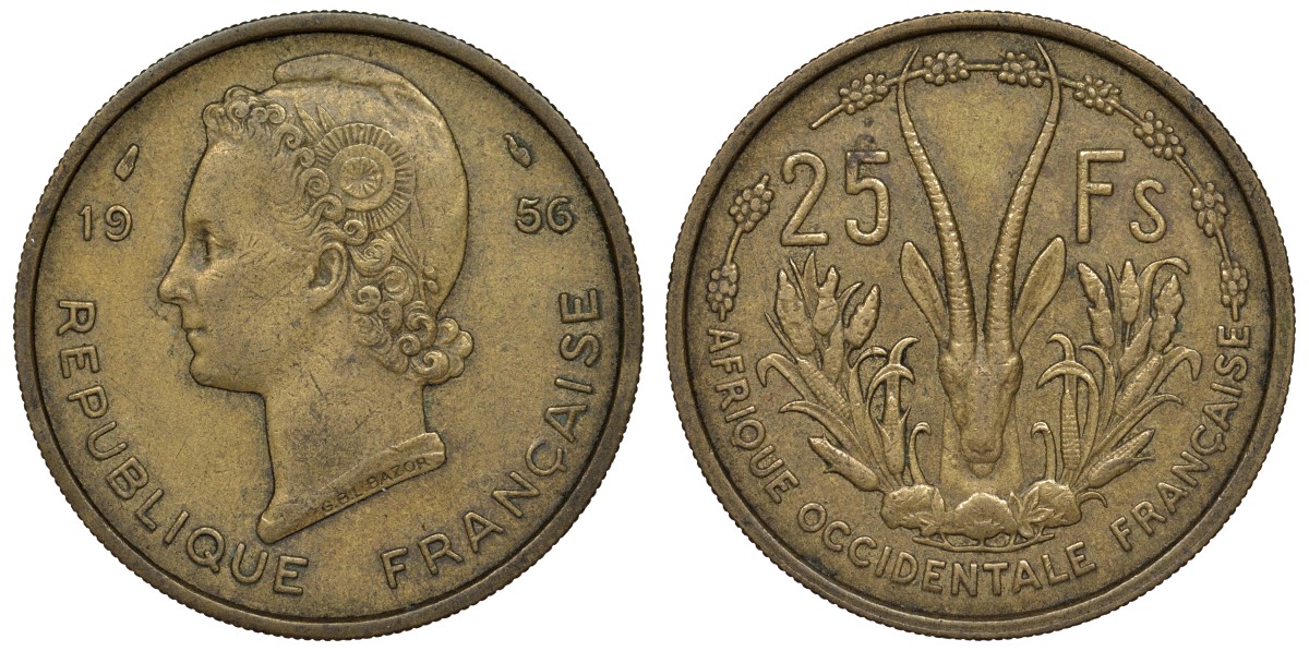 Французская Западная Африка 25 франков 1956 антилопа KM 7 алюминиевая бронза 4123-243