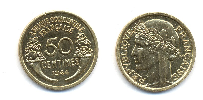 ФРАНЦУЗСКАЯ ЗАПАДНАЯ АФРИКА 50 САНТИМОВ 1944 РЕДКАЯ aUNC 53-1134