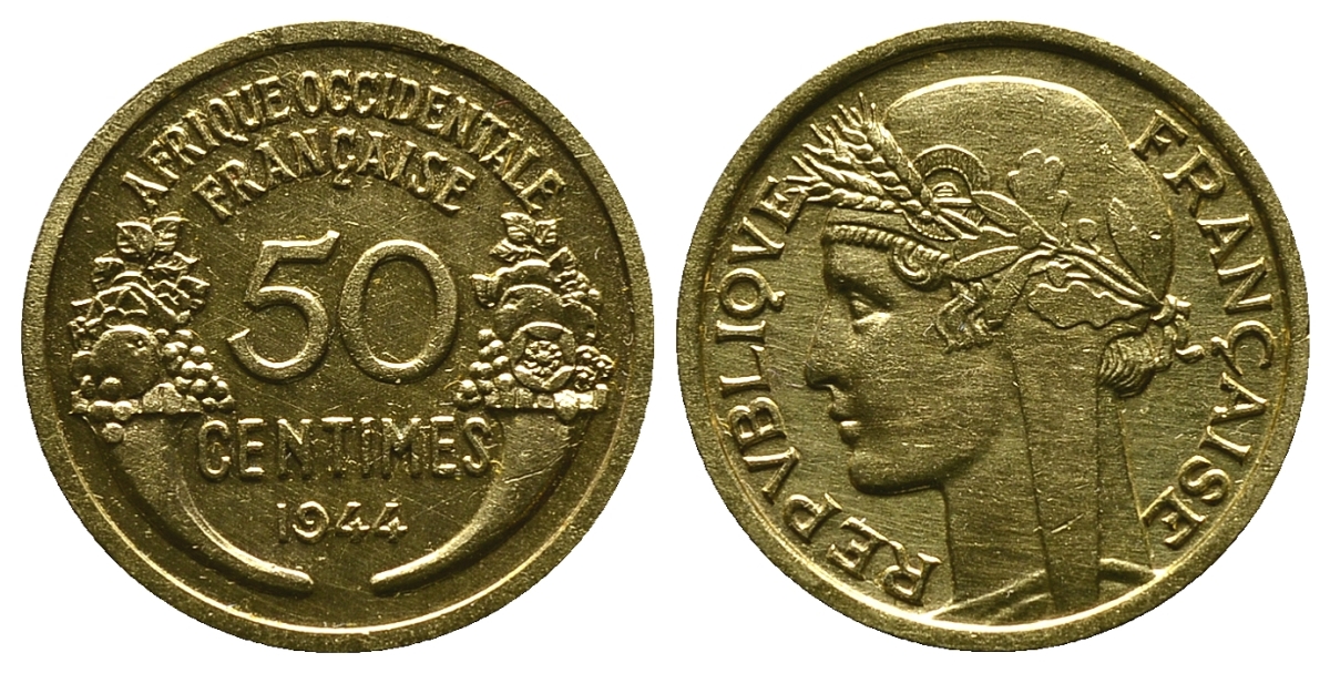 ----Французская Западная Африка 50 сантимов 1944 редкая KM 1, Lec 1 алюминиевая бронза aUNC 4381-942