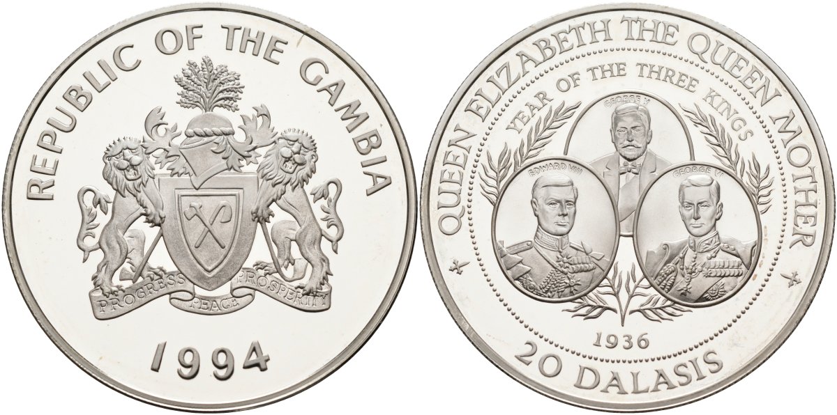 Гамбия 20 даласи 1994 серия королева Елизавета-королева мать, 1936 год трёх королей, тираж 30000 экз. KM 40 серебро PROOF 1098-1-63