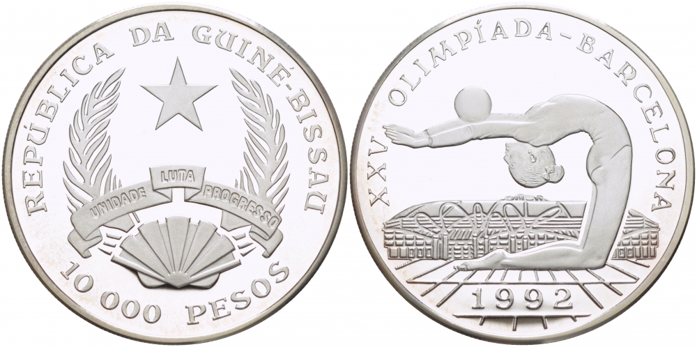 Гвинея-Бисау 10000 песо 1992 XXV летние Олимпийские игры, Барселона 1992 - гимнастка с мячем KM 30 серебро PROOF 1068-2-11