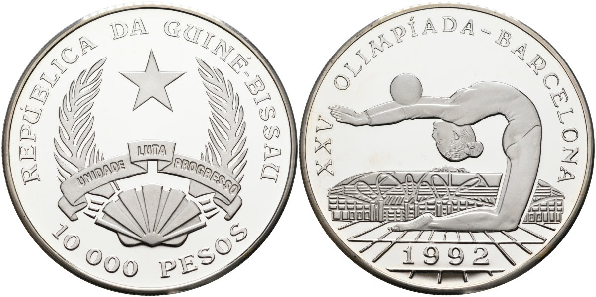 Гвинея-Бисау 10000 песо 1992 XXV Олимпийские игры 1992 года в Барселоне, гимнастка, тираж 10000 экз. KM 30 серебро PROOF 1098-2-32