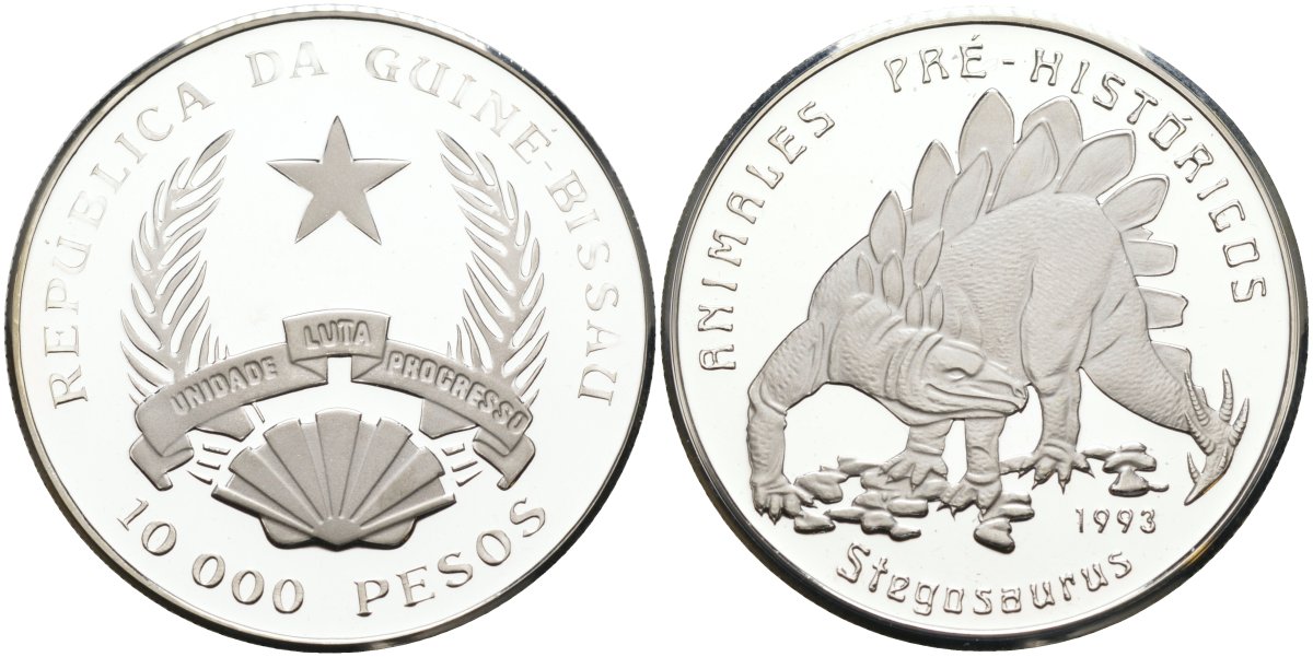 Гвинея-Бисау 10000 песо 1993 серия доисторические животные, стегозавр KM 32 серебро PROOF 1095-7-23