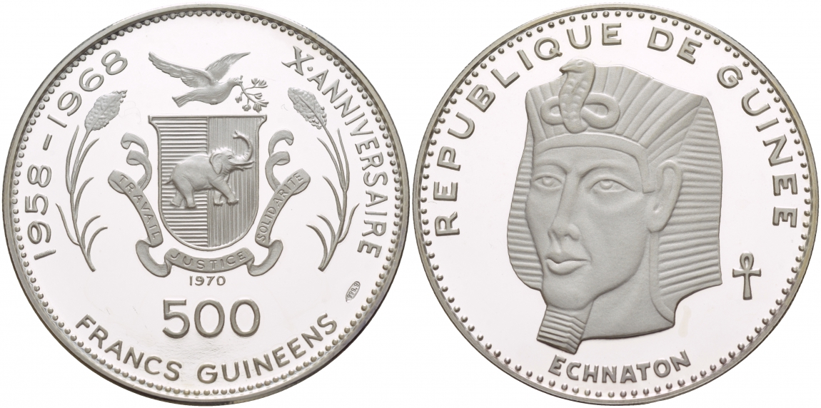Гвинея 500 франков 1970 10 лет независимости (1958-1968), фараон Эхнатон, тираж 4180 экз. KM 22 серебро PROOF 05-085-12