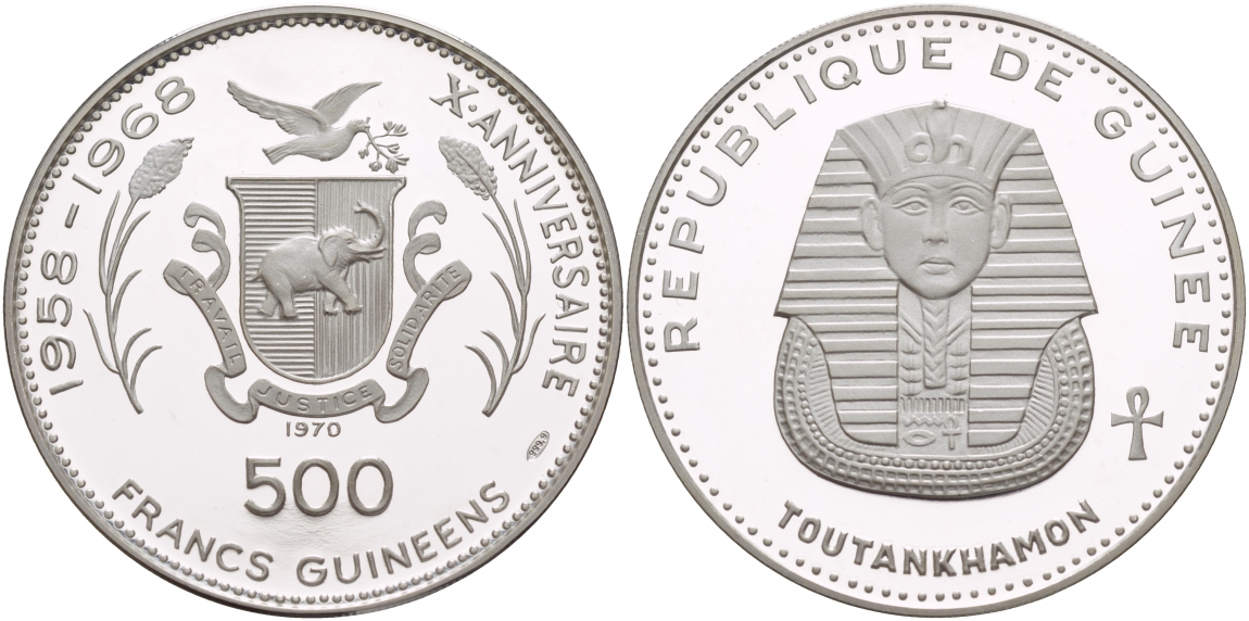 Гвинея 500 франков 1970 10 лет независимости (1958-1968), фараон Тутанхамон, тираж 4280 экз. KM 27 серебро PROOF 11-085-23