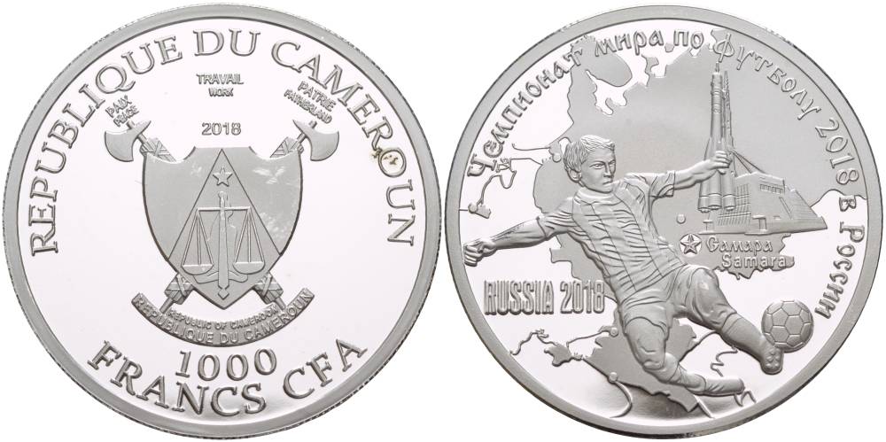 Камерун 1000 франков 2018 чемпионат мира по футболу - 2018, Россия, Самара серебро KM NEW PROOF 1088-2-64