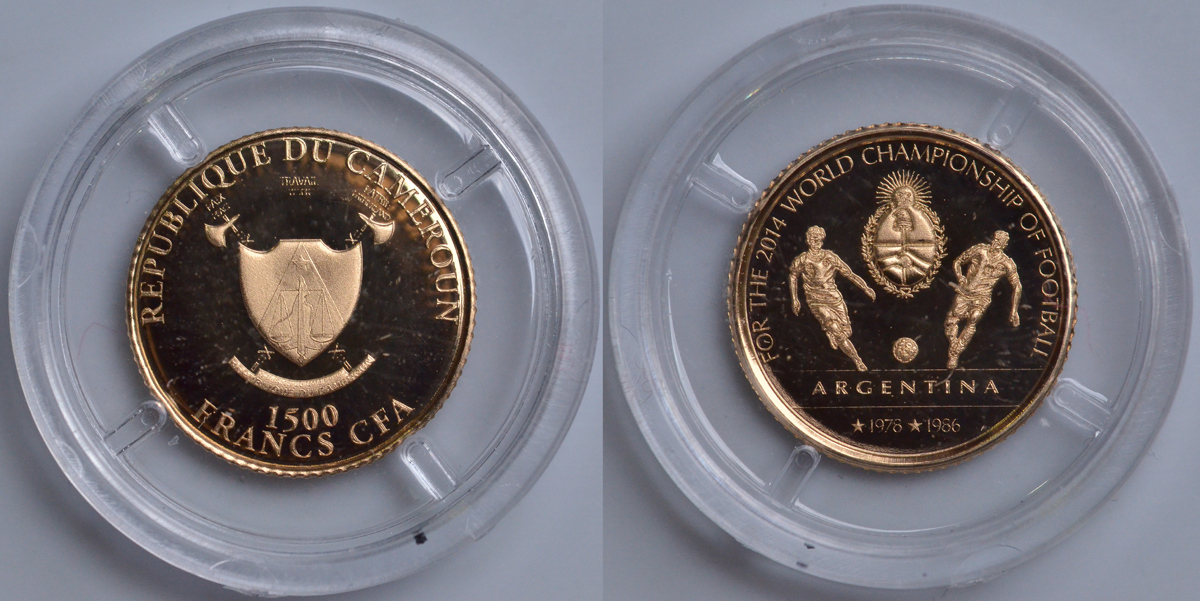 КАМЕРУН 1500 ФРАНКОВ 2014 ЧЕМПИОНАТ МИРА ПО ФУТБОЛУ - 2014, АРГЕНТИНА - ГОДЫ ЧЕМПИОНСТВА, ДВА ИГРОКА ПАСУЮЩИЕ МЯЧ KM NEW золото PROOF 00-000-00