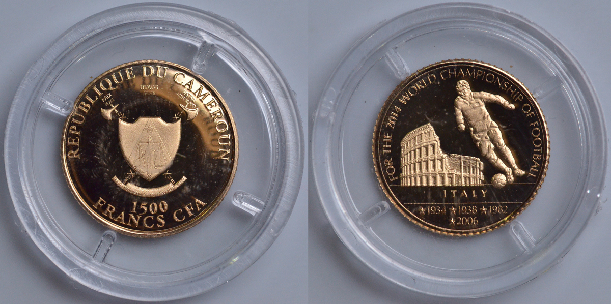 КАМЕРУН 1500 ФРАНКОВ 2014 ЧЕМПИОНАТ МИРА ПО ФУТБОЛУ - 2014, ИТАЛИЯ - ГОДЫ ЧЕМПИОНСТВА, ИГРОК С МЯЧОМ НА ФОНЕ КОЛИЗЕЯ KM NEW золото PROOF 00-000-00